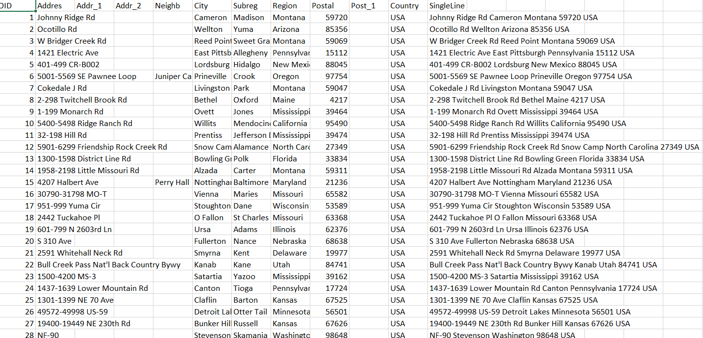 The data to be geocoded are in a csv file that contains 2000 randomly selected US addresses. We will use the address information from the SingleLine column to batch geocode all addresses.