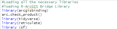 Once the R-ArcGIS Bridge is set up, we start RStudio and load the arcgisbinding package together with other packages. The function arc.check_product() binds the RStudio session to the ArcGIS Pro installation.