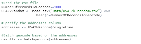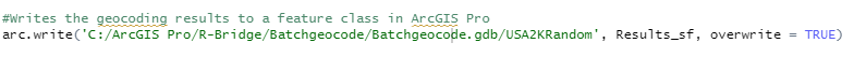 - Convert the geocoding results from R to a local geodatabase feature class using R-ArcGIS Bridge when further mapping and spatial analysis is desired in ArcGIS Pro.