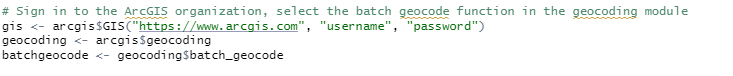 An ArcGIS Online organizational account is required to use the batch geocoding functionality provided by the World Geocoding Service. We need to sign in to the ArcGIS Online organization and load the batch_geocode function from the arcgis$geocoding module.