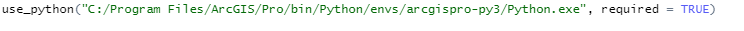 It is possible that you may have several Python versions installed on your machine. Here we use the function use_python() to specify the path of the Python binary available with ArcGIS Pro.