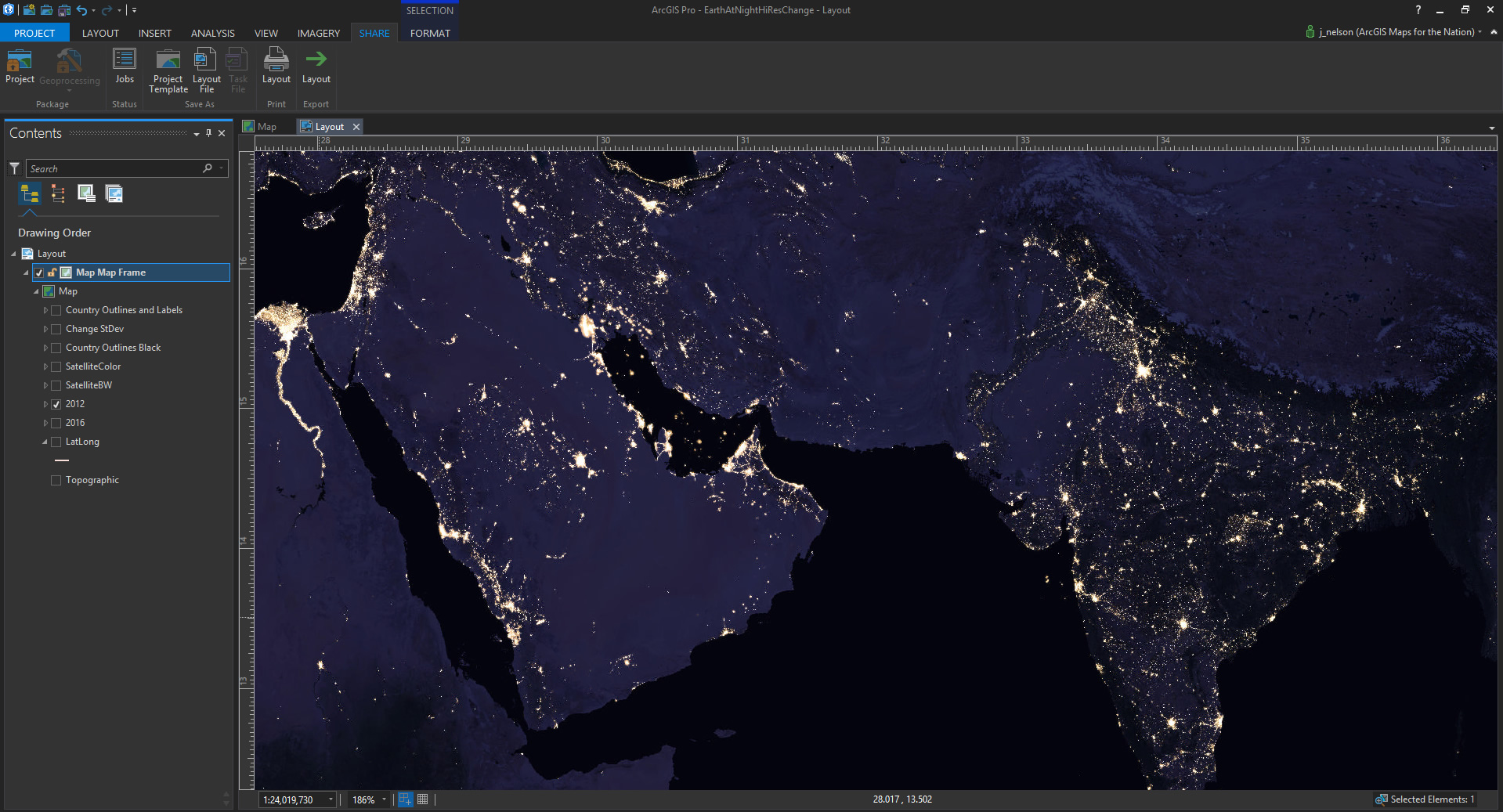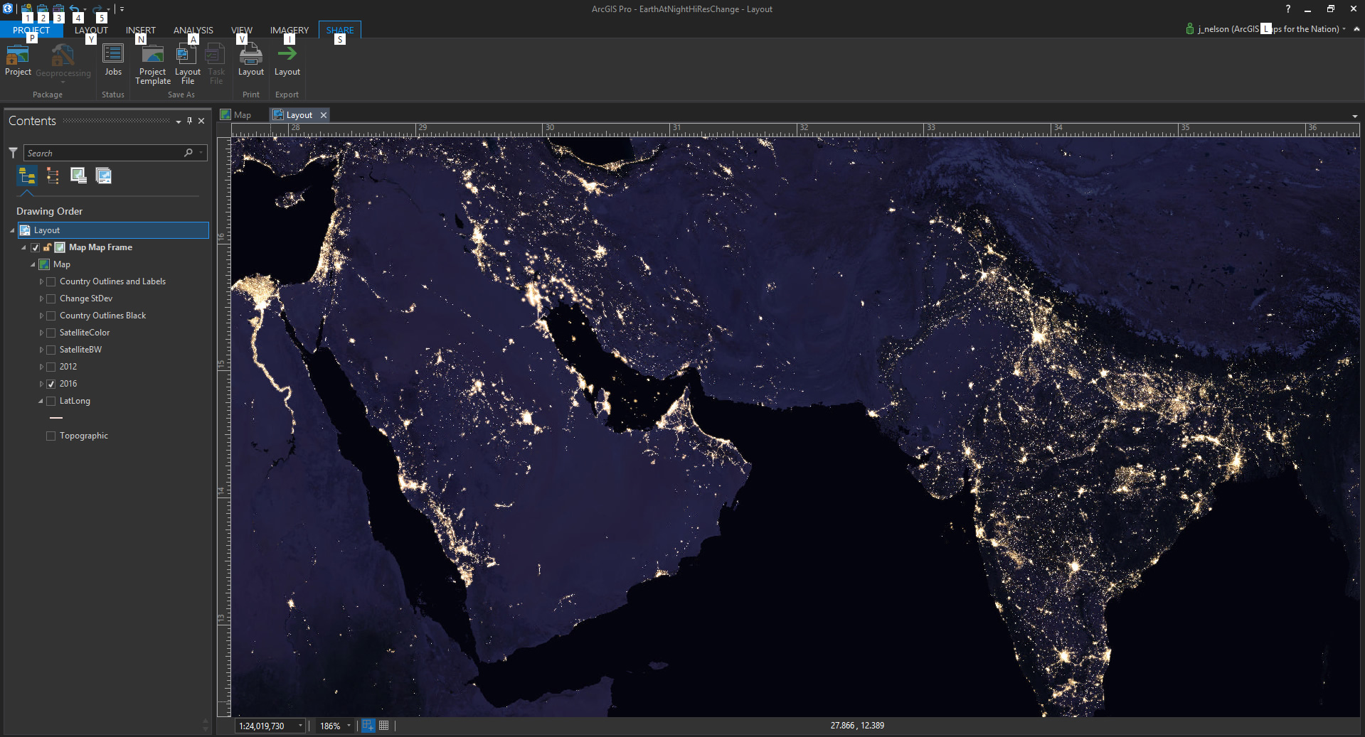 Here’s a look at the Earth At Night imagery in ArcGIS Pro. This is the 2012 version…