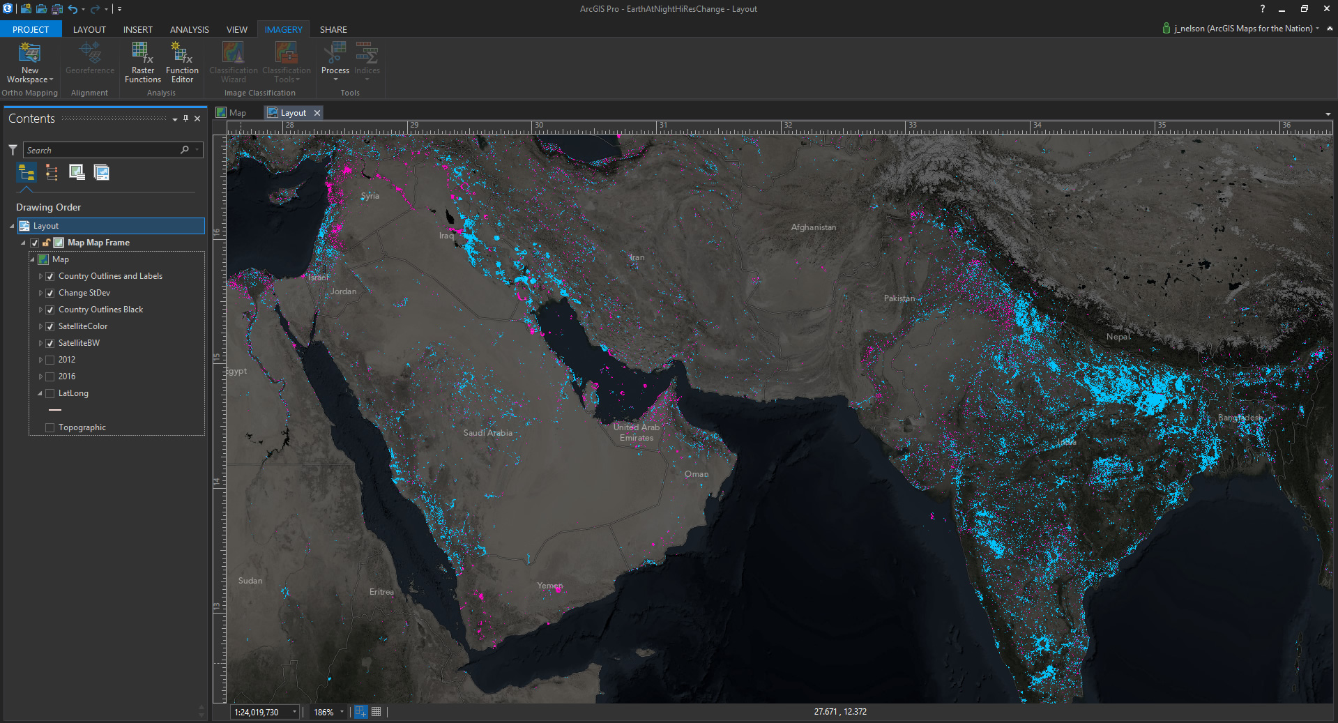 Fun! Definitely some patterns emerging of reduced nighttime illumination (magenta) in some places and increased nighttime illumination (blue) in others. But it’s lacking some context, so here it is with some muted Firefly-esque background imagery, country borders, and labels. Here is a head start on getting a dramatic basemap rolling for Firefly cartography in ArcGIS Pro.