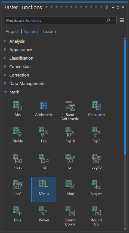 It’s time to mash these things together, so we don’t have to use our brains to see where lights are different. In the Imagery tab, there is a button called, “Raster Functions.” There are loads of canned robot hordes ready to unleash their algorithms on your data.