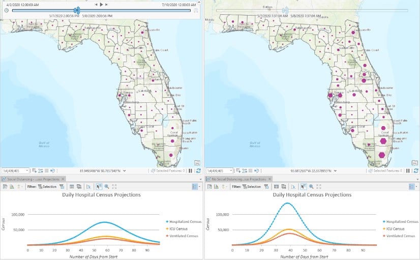 The Predictive Healthcare team at Penn Medicine created the COVID-19 Hospital Impact Model for Epidemics (CHIME) to determine when particular hospitals or regions will be oversubscribed. In addition, the CDC has provided a hospital surge model with its FluSurge 2.0 tool. The CHIME model is now available as geoprocessing tool within ArcGIS Pro and the Esri Spatial Statistics Team is working to make FluSurge available in a similar manner. Modeling scenarios can easily be updated as more data comes in. Esri is actively exploring ways to plug other models like the Institute for Health Metrics and Evaluation (IHME) model into ArcGIS to allow users to compare models and leverage the models of their choice.