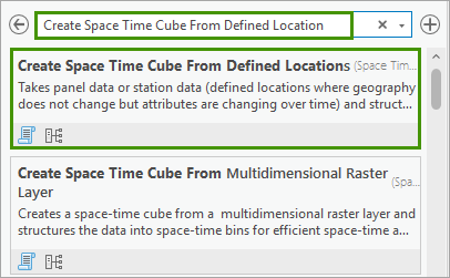1. In the Geoprocessing pane, in the search box, type Create Space Time Cube From Defined Location. In the search results, click Create Space Time Cube From Defined Location to open the tool dialog.