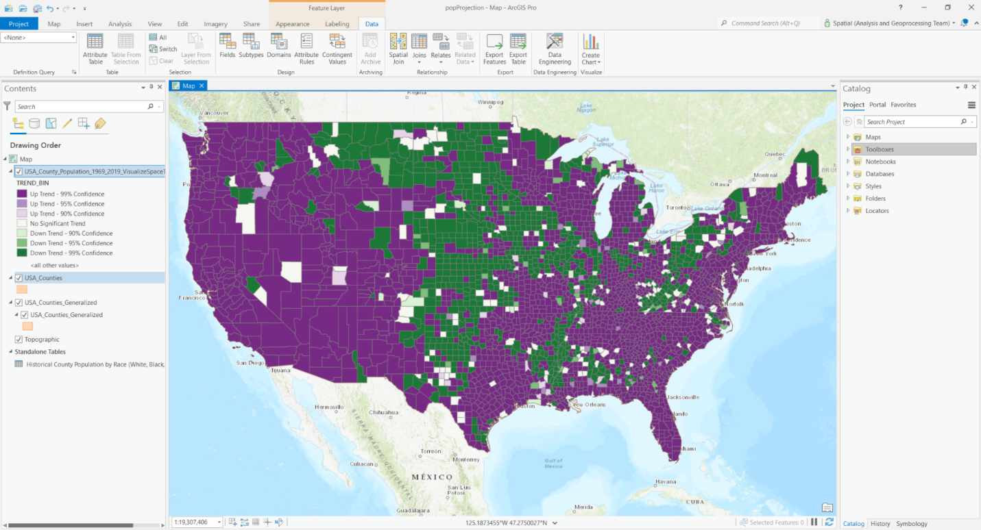 The National Cancer Institute provides two historical population datasets; Historical County Population (1969 – 2019) by Race (White, Black, Other) and Historical County Population (1990 – 2019) by Expanded Races & Hispanic/Non-Hispanic. Esri has made these datasets available in ArcGIS Online. If you’re interested in forecasting the total population, we recommend the 1969-2019 dataset since it contains a long history. However, suppose your project requires a more detailed analysis by racial or ethnic group (for example, White, Black, American Indian/Alaska Native, Asian/Pacific Islander). In that case, you’ll need to use the 1990-2019 dataset.