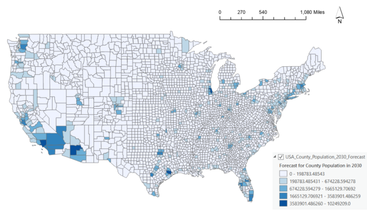Planning is about the future and having reliable estimates of the future population is critical for assessing demand for housing, energy, food, and infrastructure. While there are many different methods for predicting the future population, most methods follow a similar pattern. You gather historical population data, fit a mathematical model to that data, extend or extrapolate the model into the future to predict population, and finally, evaluate how well the model did. This can be an uphill task, particularly if you need to predict the population for many different areas. Often, finding reliable historical population data in an easy-to-use format can be the most challenging part. In this blog, we’ll share a source of historical county population data and introduce a set of exciting, easy-to-use forecasting tools available in ArcGIS Pro.