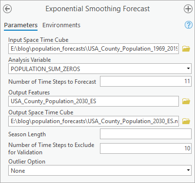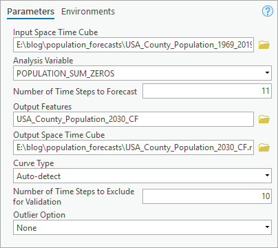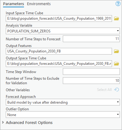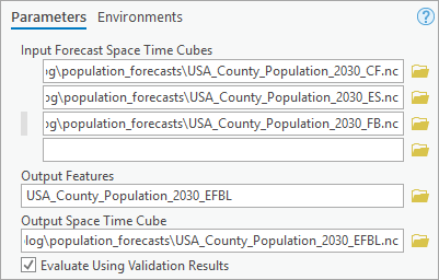 - For Input Forecast Space Time Cube, add USA_County_Population_2030_CF.nc, USA_County_Population_2030_ES.nc, USA_County_Population_2030_FB.nc.