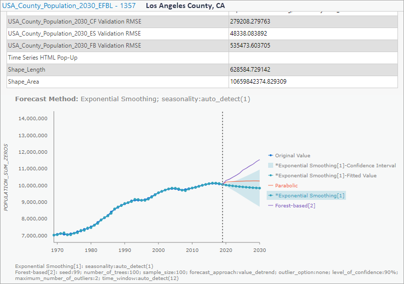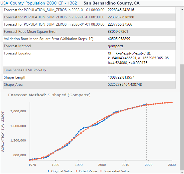You could save the forecast results as an Output Features and an optional Output Space Time Cube, which can be consumed in the Evaluate Forecasts By Location tool to evaluate forecast results from various forecast methods. The Output Features contain the population forecasts for 11 years and the formulas of parametric curves in the attribute table. The Output Features are symbolized with the forecasted value of the final forecast time step, the population forecast of the year 2030 in this case.