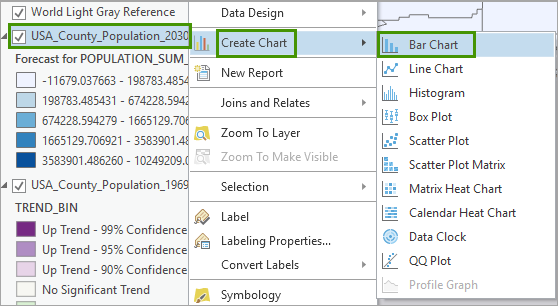 4. In the Contents pane, right-click USA_County_Population_2030_CF, point to Create Chart, and choose Bar Chart.