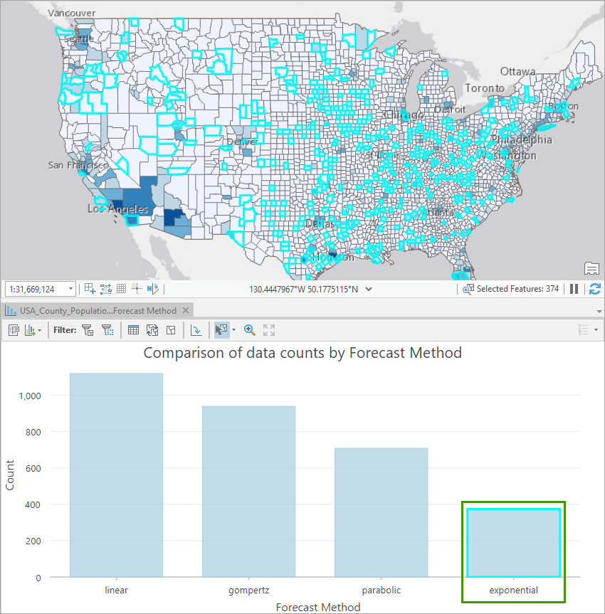 6. Click on a specific type of curve in the bar chart, all the places where the specific curve fit forecast was applied to will be highlighted on the map. This interaction makes it extremely easy for you to understand the different trends and characteristics of population growths among the US counties. You can also go one step further and symbolize the map using the Forecast Methods field.
