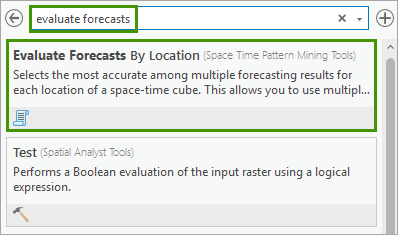 1. In the Geoprocessing pane, in the search box, type evaluate forecast. In the search results, click Evaluate Forecasts by Location to open the dialog.