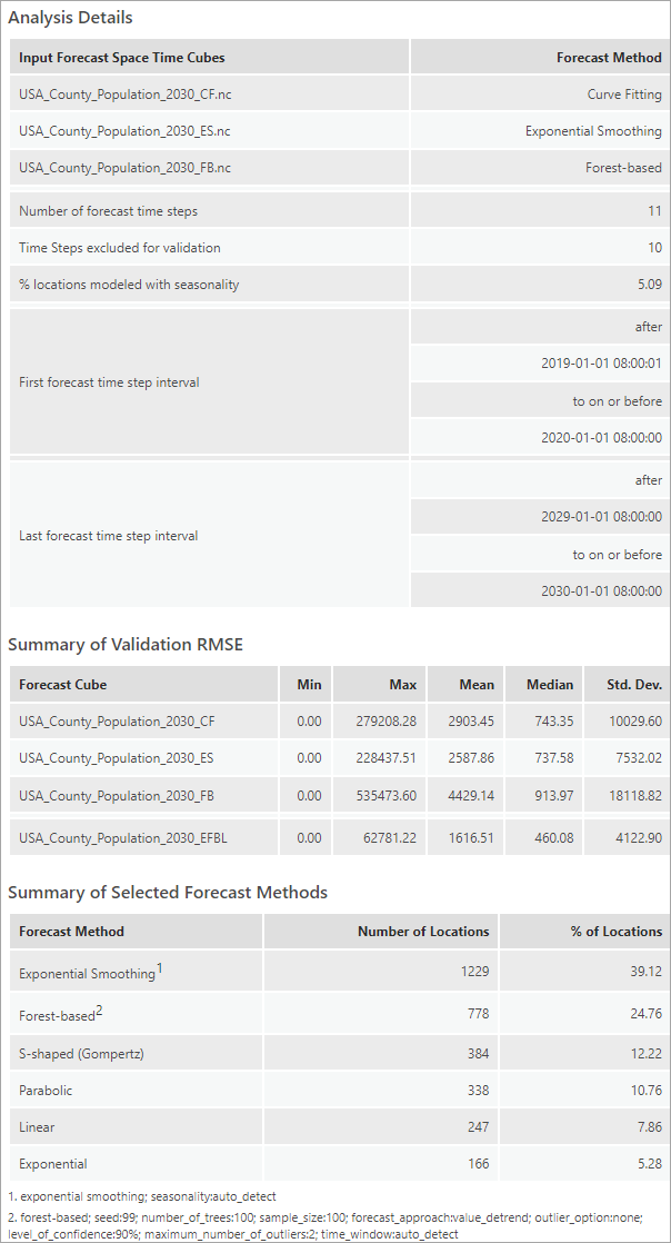 This tool creates geoprocessing messages to help you understand the results. The messages contain information about the structure of the forecast cubes, summary statistics of the RMSE across forest cubes, and summaries of each forecast method is chosen by how many locations as the best method.