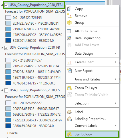 5. In the Contents pane, right-click USA_County_Population_2030_EFBL, choose Symbology.