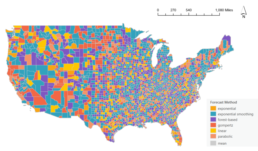 4. Click a couple of counties of interest and explore the pop-up chart. The best forecast method at that location will be highlighted in the legend to the right of the chart. You could also click on other methods in the legend to visualize the forecasted values of a specific method, or hover over the chart to check the details of each time step.