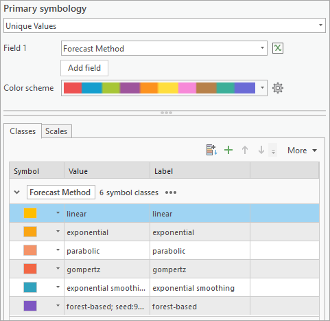The Output Features will be added to the map and symbolized based on the value of final forecasted time step of the selected method at each location. An alternative way to visualize the result is to symbolize the map using the Forecast Method chosen at each location. Let’s quickly adjust the symbology.