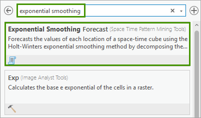 1. In the Geoprocessing pane, in the search box, type Exponential Smoothing. In the search results, click Exponential Smoothing Forecast to open the dialog.