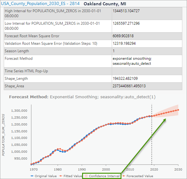 3. Click a few counties on the output features to see the detailed statistical results and informative pop-ups. Notice that the method also provides a 90% confidence interval of the forecasts, shown as the transparent orange cone around the forecasted line.