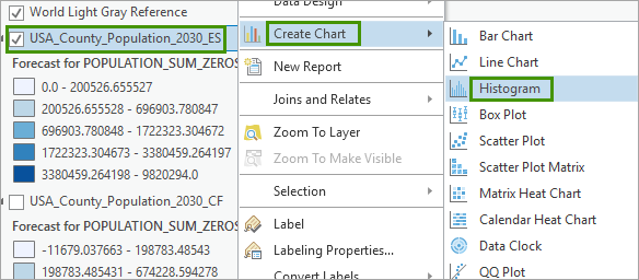 4. In the Contents pane, right-click USA_County_Population_2030_ES, point to Create Chart, and choose Histogram.