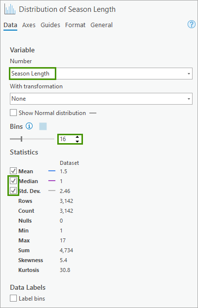 The chart updates to show a histogram of temperature measurements and the chart title Distribution of Season Length appears. Additionally, the Statistics group in Chart Properties updates, showing various statistics for the Season Length histogram field.