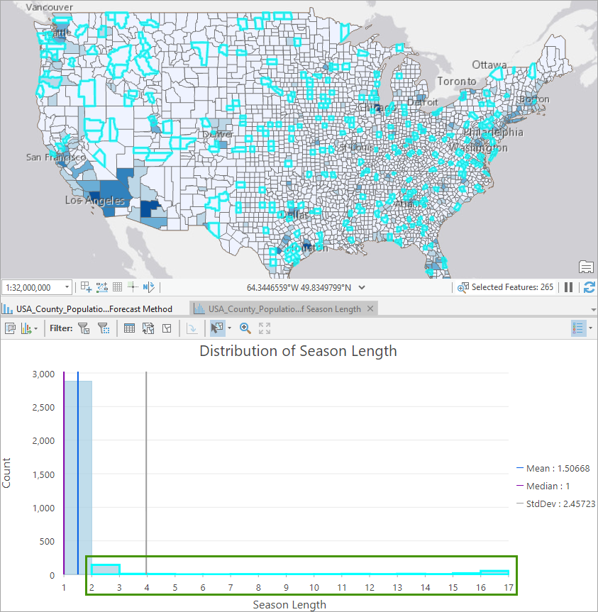 7. You might be curious about the counties that have some kinds of seasonality. Drag a box over the bins large than 1 to highlight locations with season lengths greater than 1 from the histogram chart and show them on the map. You can also click to see their pop-ups to get more details.