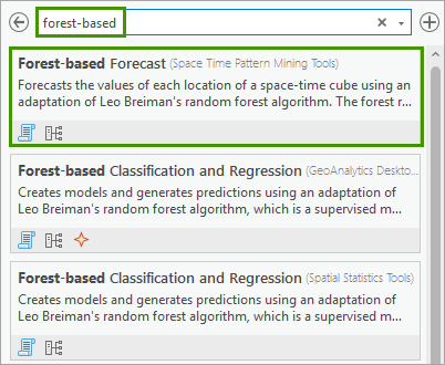 1. In the Geoprocessing pane, in the search box, type forest-based. In the search results, click Forest-based Forecast to open the dialog.