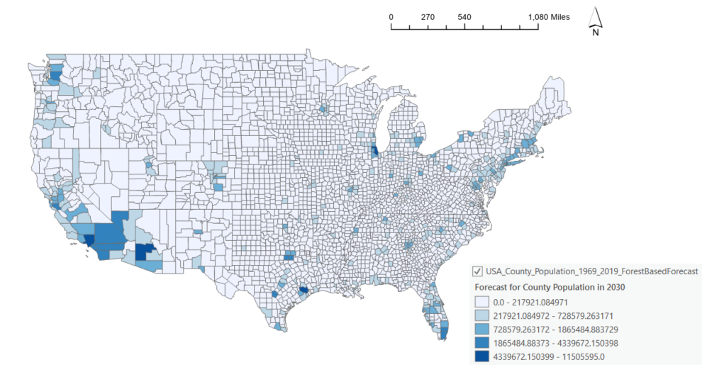We could also use the Forest-based Forecast tool to predict future population for each county. Forest-based Forecast will use an adapted random forest algorithm to train space-time data based on time windows and forecast future time slices for each location.