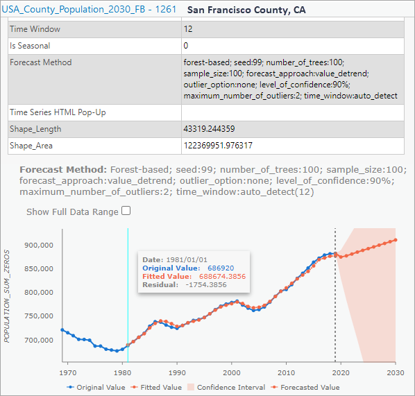 3. If you click on some of the counties and look at the pop-up charts, the line chart of the observed value and fitted values will indicate how well the model forecasted the yearly population in the county. You can also see the Time Window used in that location and if any seasonality is detected at that location. In the following case, no seasonality is detected at San Francisco County, CA therefore 25% of total time steps, which is rounded down (25% * 51) to 12 steps and used as the time window.