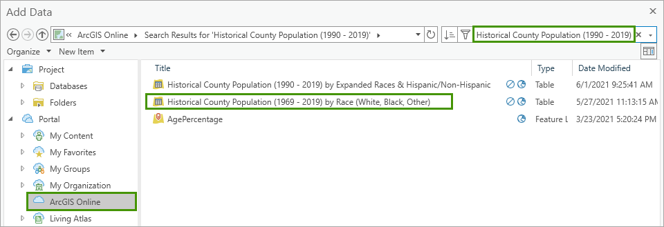 3. In the Add Data window, under Portal, click ArcGIS Online. Then, type Historical County Population (1990 – 2019) in the search bar and press Enter. Select Historical County Population (1990 – 2019) by Race (White, Black, Other) and click OK.