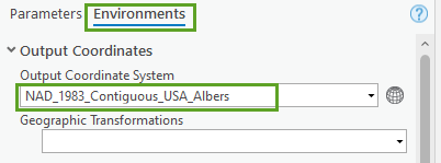 9. Click the Environments tab. Click the Select Coordinate System button (small globe) and select NAD 1983 Contiguous USA Albers (under Projected Coordinate System > Continental > North America) as the Output Coordinate System.