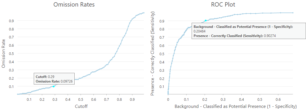 16. Click on a point in the Omission Rates chart that just a little bit underneath the Omission Rate equals 0.1. So if we want an Omission Rate that is slightly less than 10%, we can use 0.29 as the Cutoff instead, and in this case, we will pick up 20.48% background points as potential presence locations, which is also a good rate.