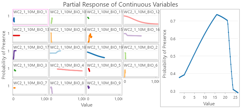 19. In the chart view, you will see the new small-multiple of line charts shown in grids to the left, with a Preview window to the right. The Preview chart is highlighted by a pink outline in the grids. Currently, it’s highlighting the response curve of WC2_1_10M_BIO1, the annual mean temperature. The presence probability of desert turtles will be low if the annual mean temperature is too low or too high, it increases fast from 0 to 15 °C and then goes downs afterward, and even faster after hitting 20 °C.
