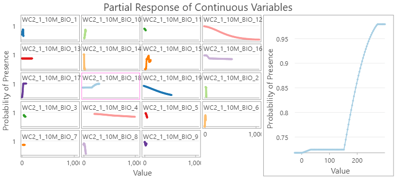 20. Click on the grid line chart titled WC2_1_10M_BIO18, the precipitation of warmest quarter, the preview will be updated. Hover over the two elbow points in the preview chart to check the exact values in both x-axis and y-axis. It can be interpreted as the probability of presence is relatively low when precipitation of warmest quarter is less than around 150 millimeters, then the probability increases almost linearly as the precipitation of warmest quarter increases, and hit the roof of 0.98 when precipitation of warmest quarter is more than 270 millimeters.