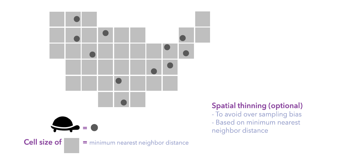 - thinning the presence points to be at least 10 km apart to avoid sampling bias.