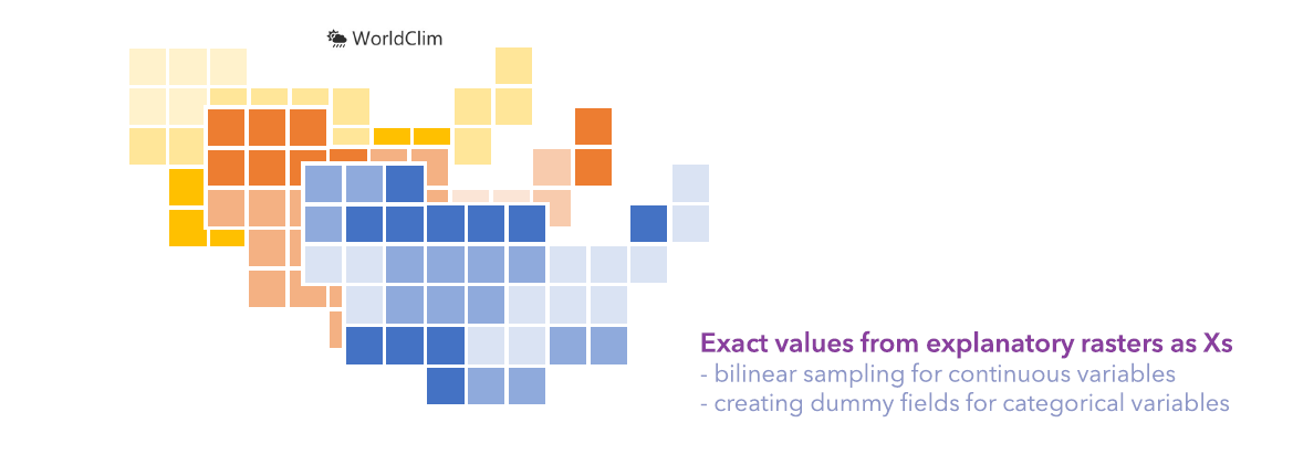 - extracting values from the explanatory rasters, to be specific, using a bilinear sampling method for continuous variables, and creating dummy fields for categorical variables.