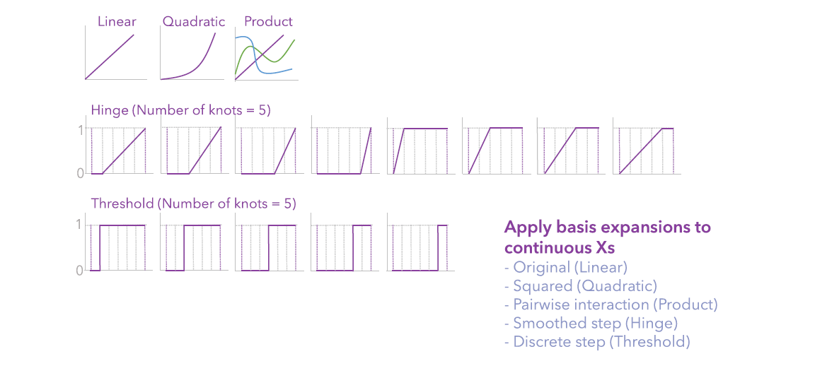 - For Explanatory Variable Expansions (Basis Functions), in addition to Original (Linear) by default, check Squared (Quadratic), Pairwise interaction (Product), and Smoothed Step (Hinge).