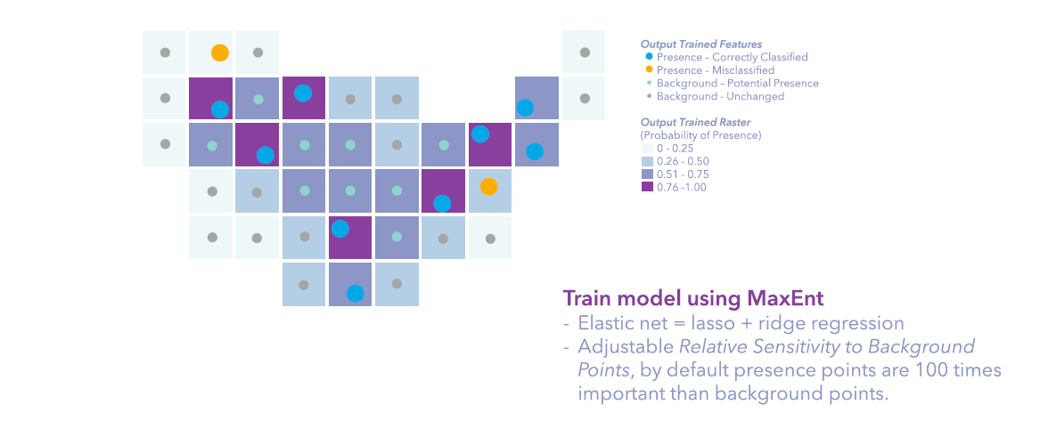 The tool estimates the presence of a phenomenon in a study area using previously known presence locations and explanatory factors. The easiest way to understand this tool is to think of it as a special logistic regression. First, it adds some transformations to the explanatory variables, so adding a little bit complex to your model but also better fit and better prediction power. Second, it just has smaller punishments on background points, since background points are locations in the study area that are potential to see the presence of the species or phenomenon, so what we care most is whether presence locations are predicted to be present, but not really worried if background locations are predicted to be absent. Third, it uses elastic net, which is a combination of lasso regression and ridge regression, to eliminate non-necessary variables and give relatively small betas to the variables.