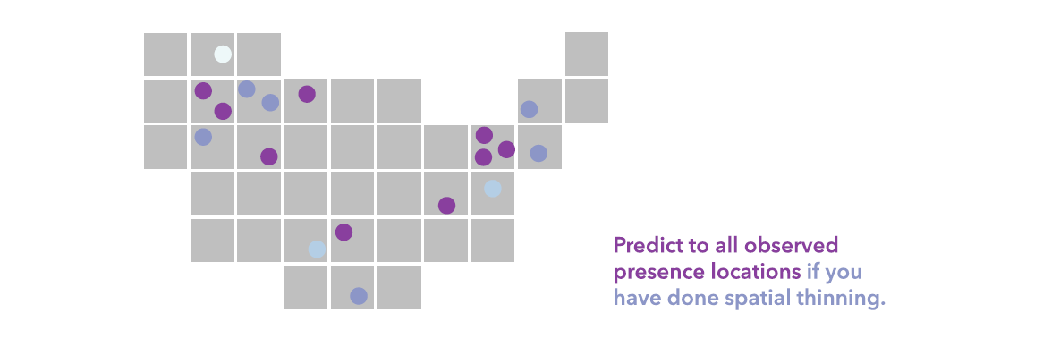 - Predicting the probability of presence to all the observed presence locations if you have done spatial thinning, or predict to other locations, or predict to the future. In the previous run, we predicted for the entire United States.