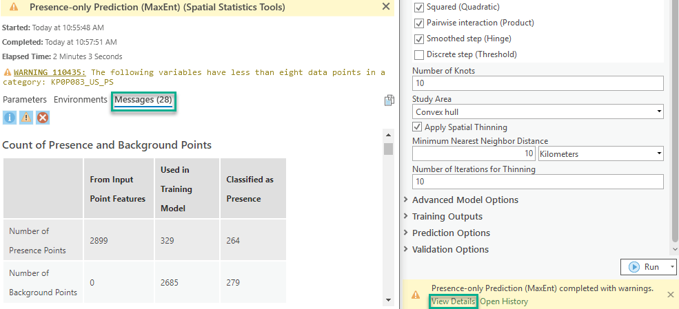To be noticed, the Presence-only Prediction (MaxEnt) tool is the first Geoprocessing tool that includes the expandable tables as accordions in the messages tab. Also, starting from Pro 2.9, all the diagnostics messages can be rendered beautifully in ArcGIS Notebook.