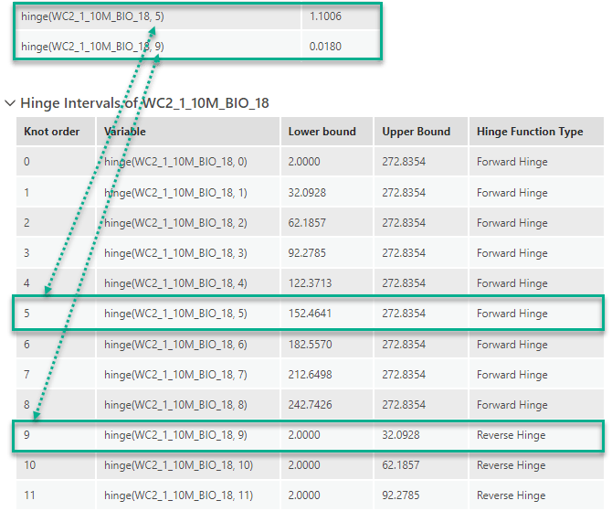 - The Hinge Intervals and Threshold Intervals tables can be expanded to show the lower and upper bound of each knot. Using these tables to understand which specific range of values of the variable has a significant impact on the probability.