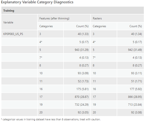 25. Scroll down again to look at the Explanatory Variable Categorical Diagnostics Different from the x-axis labels in the grid bar chart, this table contains all the categories of presence plus background points after spatial thinning. So, this table is telling you more about the study area. We can say the most common category is Category 5 (Arid, steppe, cold), followed by category 17 (Arid, desert, cold) and category 19 (Arid, desert, hot). The other categories are much less common in the study area.
