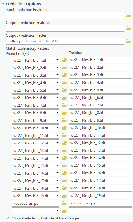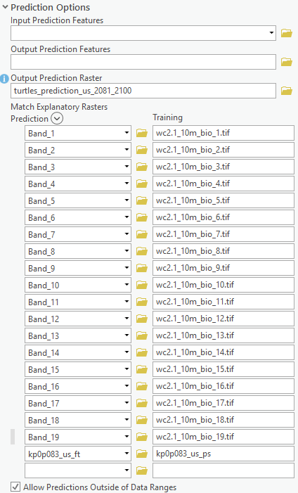 - For Match Explanatory Raster, specify Prediction column with the relative single band of the multi-band raster containing the forecasts of 19 bioclimate variables. For example, to match wc2.1_10m_bio_1.tif, specify wc2.1_10m_bioc_BCC-CSM2-MR_ssp126_2081-2100.tif\Band_1 in the Prediction column. And to match wc2.1_10m_bio_2.tif, specify wc2.1_10m_bioc_BCC-CSM2-MR_ssp126_2081-2100.tif\Band_2 in the Prediction column, so on so forth, until the 19th bioclimate raster. And to match kp0p083_us_ps, specify kp0p083_us_ft in the Prediction column. It takes a while for the tool to validate your input of each row, so thanks for your patience here.