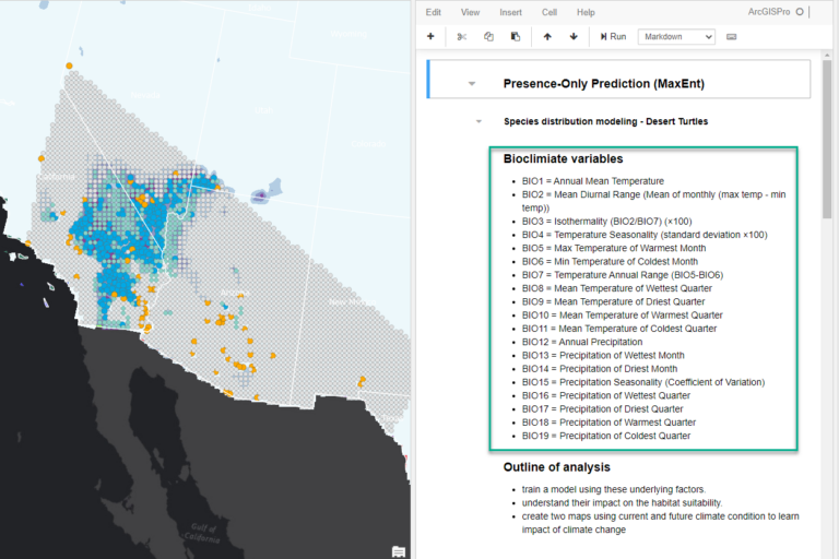 3. Drag the POP Demo Notebook view to the right side of your project and you can read the details about the meaning of the 19 Bioclimate variables, and take a quick look at the arcpy command for running the tool.