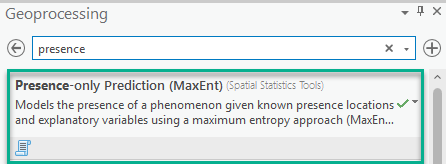 6. In the Geoprocessing pane, in the search box, type presence. In the search results, click Presence-only Prediction (MaxEnt) to open the tool dialog.
