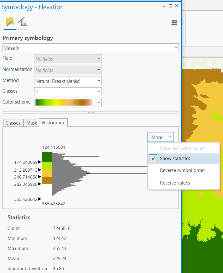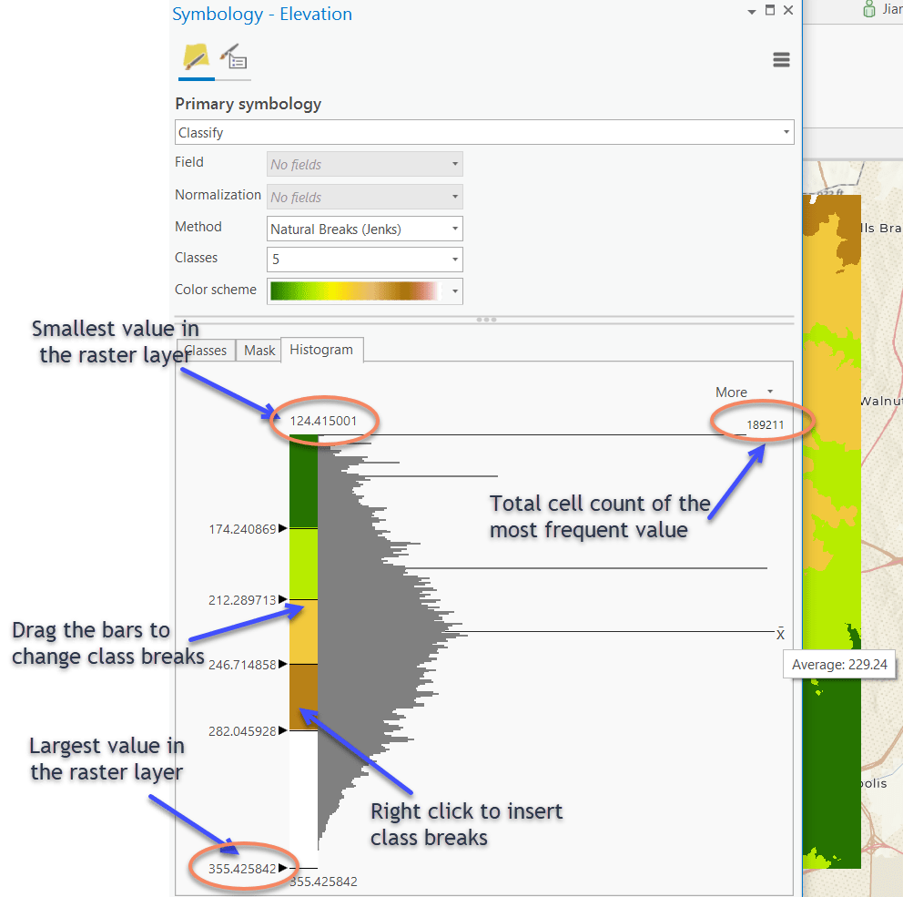 In ArcMap there is an option to see a histogram of the raster values from the Reclassify tool. The same functionality is in ArcGIS Pro by selecting the Histogram tab from the raster layer symbology pane. You can then view the histogram for the distribution of the values in the raster and interactively set class breaks. Those class breaks are immediately reflected in the map while the histogram is still open and editable. There’s no “OK” or “Apply” button to press, just drag the bars in the histogram and see them reflected in the map. This is the type of interaction users have been requesting, so try it out and see if it improves your workflow.