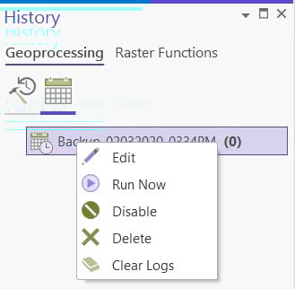Once a geoprocessing tool is scheduled, it is then listed in the Geoprocessing>Scheduled section of the History pane.