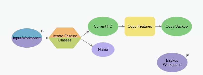 The model below loops through all the feature classes in an input workspace and then creates a backup copy to a user specified backup workspace.