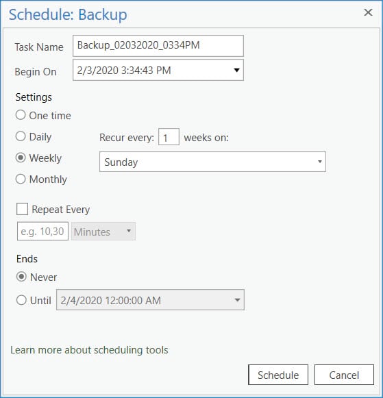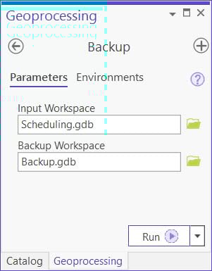 To schedule this model to run every Sunday at a specific time, open the model tool which I named “Backup” from the ArcGIS Pro project and then specify the required parameters: