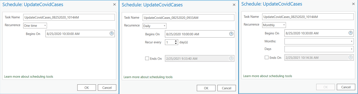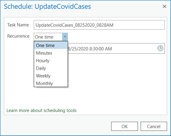 In one of my previous blog posts, I wrote about a new feature in the ArcGIS Pro 2.5 release that allows scheduling a geoprocessing tool directly from the Geoprocessing pane. Since then several users have written to me and shared their use cases where they need to schedule a geoprocessing model or script tool to run at specific times. One of the common examples is to schedule data updates. E.g., to update a hosted ArcGIS Online feature service at the end of every day when new data is available.